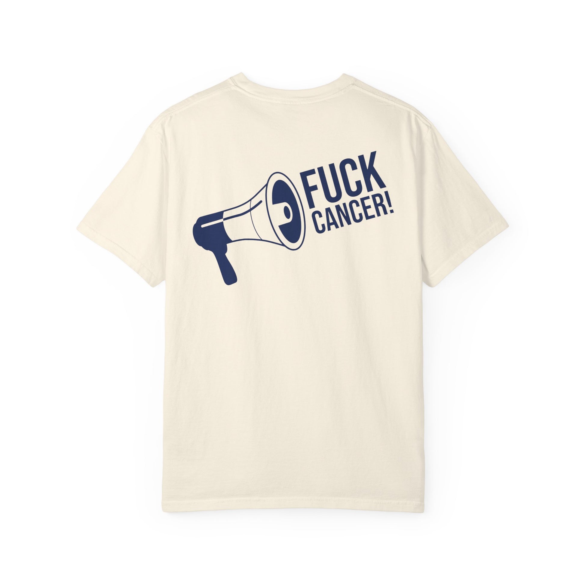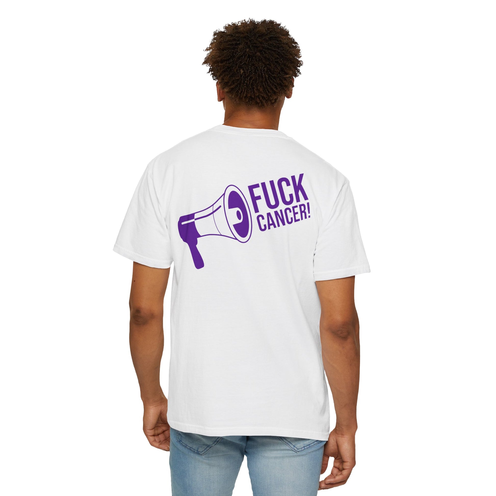 A powerful statement tee featuring a megaphone graphic with the message 'fuck cancer'. This unisex garment-dyed t-shirt is perfect for cancer survivors, activists, and supporters. It gives off a bold and empowering vibe, making it a great conversation starter. Ideal for wearing to cancer awareness events, rallies, and fundraisers.